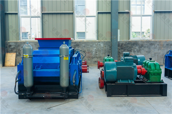 (1)对辊制砂机,该对辊制砂机适用于进料粒度小于80mm、成品粒度要求50目-20mm的细碎作业,是由两台电机带动两个辊子进行工作的。该对辊制砂机对物料的破碎作用主要是压碎兼有研磨作用。